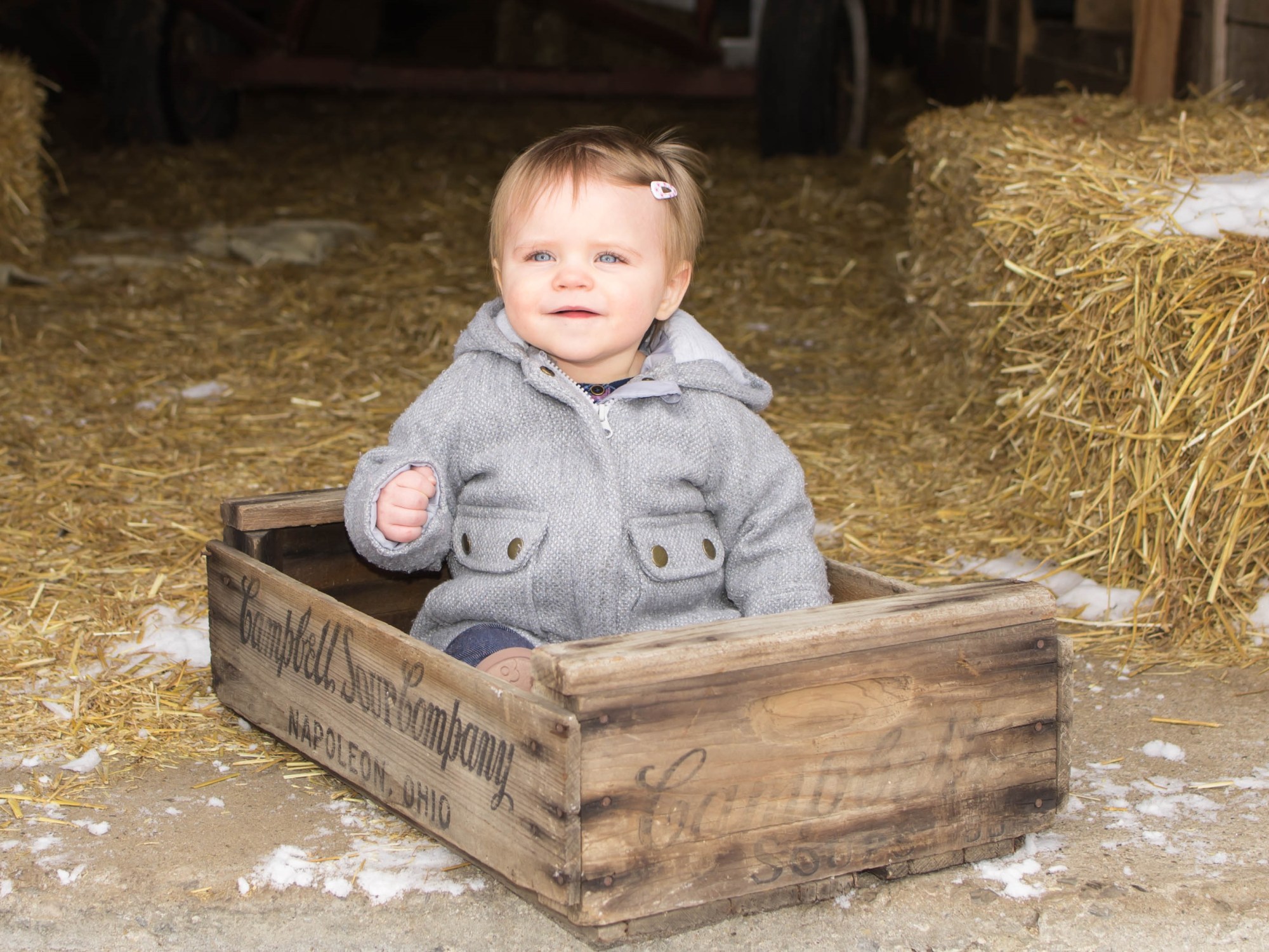 I had the pleasure of shooting sweet little Maddie who recently turned one year old! We started at her grandparent’s home where I got some sweet shots of her posing in front of the fireplace. We then moved outside for some pictures at her great-grandparent’s farm. It was a perfect day for pictures as the freshly-fallen snow helped reflect some great light on her as she posed inside and next to the gorgeous red barn. Also gorgeous-her bright blue eyes that I could get lost in… Happy Birthday Maddie!